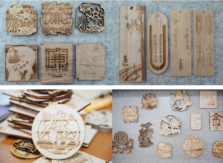 活动以“廉心筑未来”为主题,深入挖掘廉洁文化内涵,将廉政箴言、历史典故等元素转化为设计灵感。在学生创新实践中心的教师指导下,学生通过激光雕刻技术,将‘清若荷花不染尘’‘虚心劲节’等廉洁箴言、意象转化为实物——如印刻‘廉’字的木质印章、绘有翠竹图案的廉政书签,让抽象的廉洁理念通过精准的激光雕刻‘落地’,实现‘技术精度’与‘文化温度’的结合。