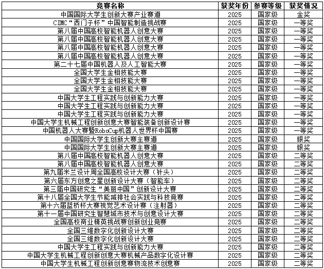 在高级别赛事中,中心(学院)教师指导的团队成绩显著:在中国国际大学生创新大赛(2025)中获产业赛道金奖1项、主赛道银奖2项;在工程实践与创新能力大赛、智能机器人创意大赛、机器人及人工智能大赛、机械工程创新创意大赛等专项赛事中,共斩获国家级一等奖14项、二等奖14项、三等奖16项及多项优秀奖项。获奖项目集中体现了学生突出的创新思维与创业潜能,以及工程实践与解决复杂问题的综合能力。