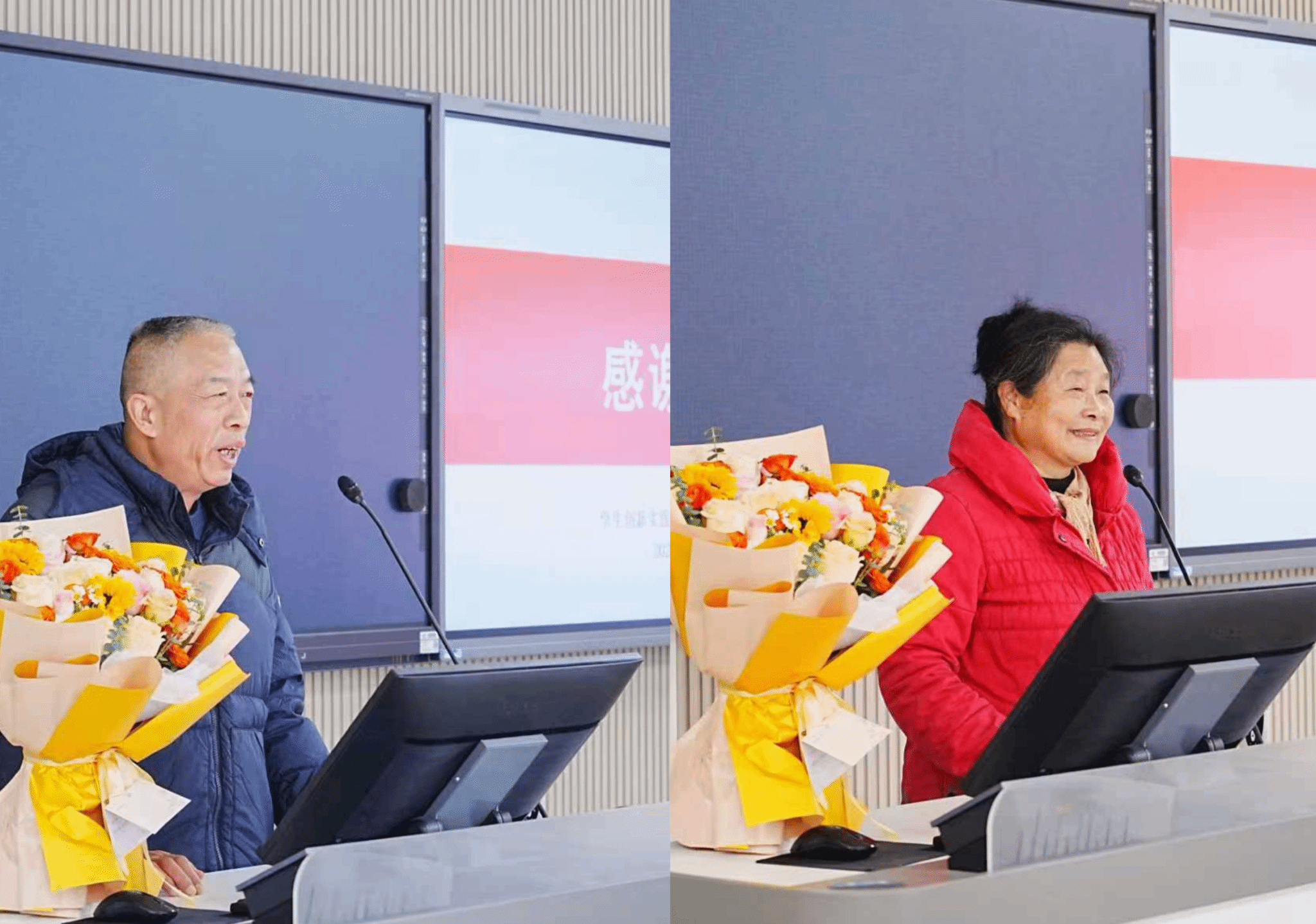 接下来,中心(学院)为2025年光荣退休的郑朝霞、刘庆海两位老师举行了简朴而隆重的致谢仪式。领导班子代表全体教职工向两位老师多年来的辛勤付出和卓越贡献致以最崇高的敬意与最诚挚的祝福,现场掌声经久不息,充满了对前辈的感激与不舍。